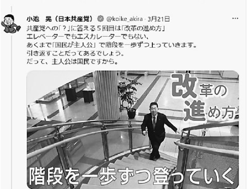 (5)「改革の進め方」では、「共産党が政権に入るといつの間にか社会主義になるんじゃないかと。そんなことはありません。私たちが進めようとしている改革は階段を一歩ずつ上っていく」と、実際に階段を上り下りしてみせながら、どんな改革も選挙で国民の信任を得て進めることを説明しています。