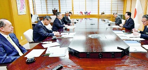 (写真)達増知事(右手前から2人目)と懇談する(左手前から)高田、斉藤両県議、小池書記局長、菅原県委員長、吉田衆院東北比例予定候補=15日、岩手県庁 |