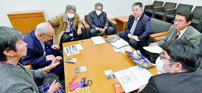 (写真)馬毛島への米軍施設に反対する市民・団体連絡会の山内光典会長(中央)ら要請団と懇談する(その右へ)小池晃書記局長と田村貴昭衆院議員=16日、国会内 |