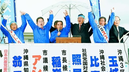 稲嶺市長、アシトミ浩市議補選候補に、翁長知事や、南城市長選に勝利した瑞慶覧長敏氏、日本共産党の小池晃書記局長、照屋寛徳(社民)、玉城デニー(自由)両衆院委員、比嘉京子県議(社大)らが並び立った名護十字路。小雨のちらつく曇り空の下、弁士の一言一言に、聴衆から熱い歓声と拍手が響きわたりました。