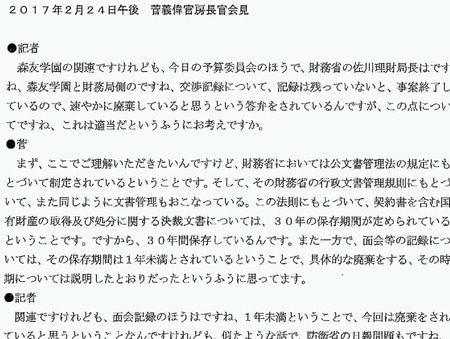 ○国務大臣(菅義偉君) これも度々申し上げておりますけれども、今委員からお話がありましたように、佐川局長が、交渉記録は残っていない、事案終了後に破棄、廃棄していると、適当かという、これは記者会見のとき質問を受けました。これに対して私は、財務省の文書管理は公文書管理法に基づいて作成された行政文書管理規則によって行われている、決裁文書については三十年の保存と決められ、面会記録については一年未満の保存で事案の終了後廃棄すると決められている、このように、財務省のまず一般文書、この管理の規則について申し上げました。(発言する者あり)