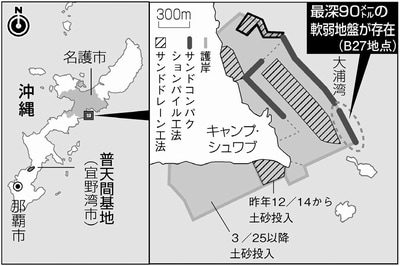そして、そもそも辺野古には基地など造れるのか。軟弱地盤が九十メートルです。七万七千本の砂ぐい。しかし、日本には六十五メートルまでしか工事の実績はない。九十メートルまでくいを打てるサンド・コンパクション・パイル工法の船はない。技術的に不可能じゃないですか。